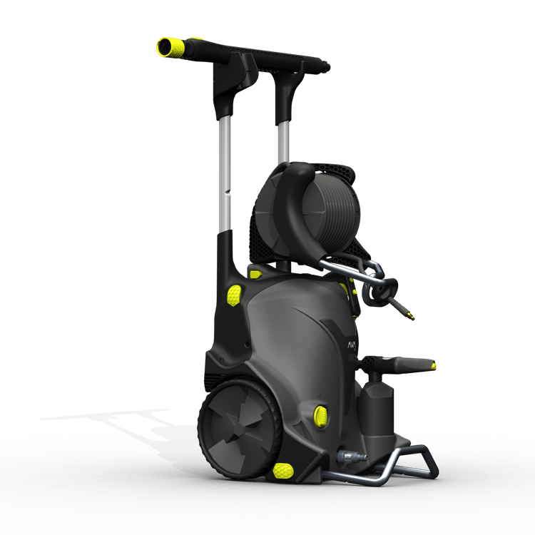 Die Geräte der AVA Master Serie weisen eine weitere Besonderheit auf, die sich im Alltag sehr bewährt hat und von der nicht nur die Nutzer, sondern auch Kritiker und Tester überzeugt sind: Am unteren Teil des Gehäuses befindet sich eine integrierte, herausziehbare Kippsicherung. Sie besteht aus einem Rohrrahmen, der im Nichtgebrauchsmodus der Geräte versenkt im Gehäuse schlummert und erst bei Betrieb der Reiniger herausgezogen wird. Er ist so platziert, dass er das Gerät auch dann vorm Umkippen schützt, wenn der Hochdruckschlauch bereits ganz abgerollt ist und daran weiter gezogen wird.