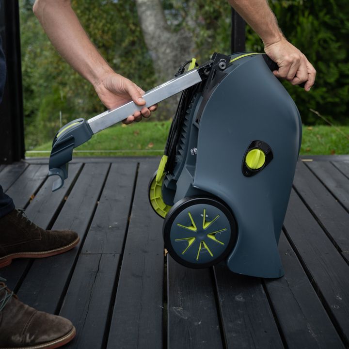 Er kann mithilfe des neuen, klappbaren Handgriffs sehr schnell einsatzbereit gemacht und mit seinen stabilen Rädern schnell an seinen Einsatzort gebracht werden. Ebenso schnell ist er auch wieder verstaut. Dank dieser Funktionalität findet er überall einen Platz zum Verstauen und Aufbewahren und ist auch sehr leicht im Kofferraum eines Autos zu transportieren.
